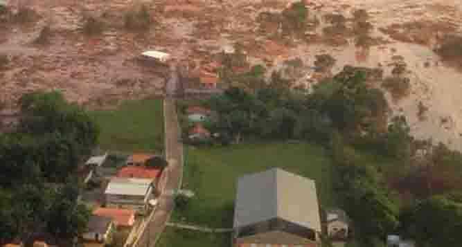 Onda de lama e detritos, que desceu da barragem que se rompeu, atingiu parte do distrito de Bento Rodrigues, a 23 quilômetros de Mariana, em Minas Gerais