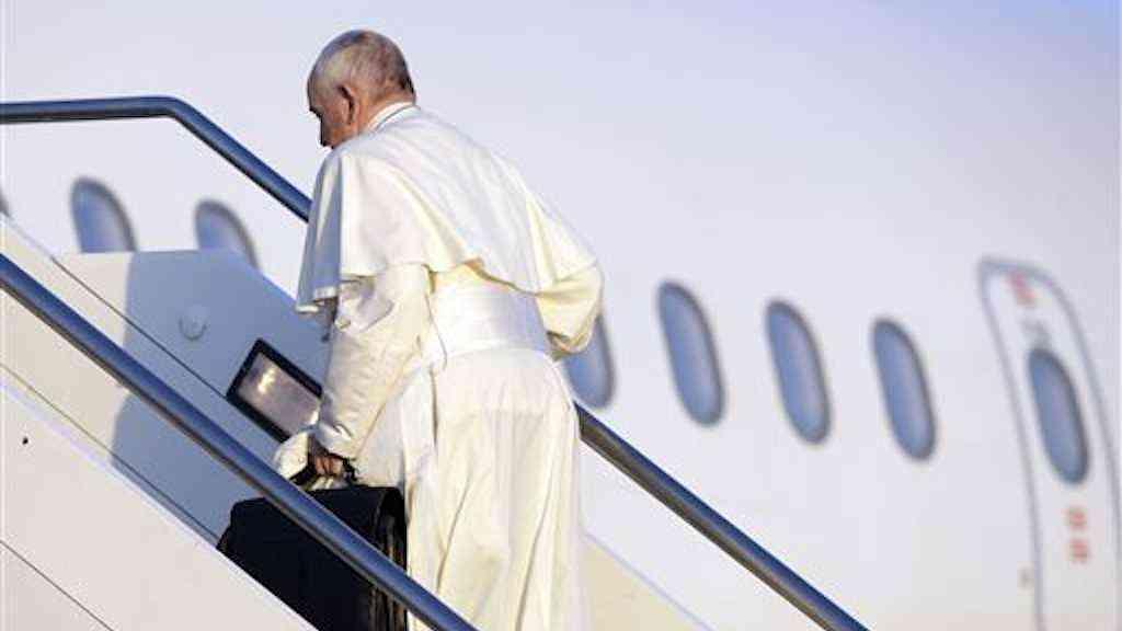 Papa Francisco voltando ao Vaticano neste sábado após sua visita relâmpago a uma ilha grega