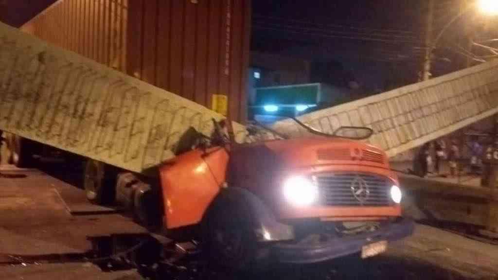 Uma carreta que transportava um contêiner bateu sobre a estrutura de um viaduto em obras e derrubou uma estrutura de toneladas de concreto.