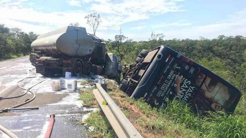 Um acidente envolvendo um caminhão tanque, carregado com óleo diesel, e um ônibus particular, no km 77, da Rodovia 040, entre Cristalina e Luziânia, em Goiás, por volta das 8h40 deste sábado, deixou uma pessoa morta e cinco feridas.