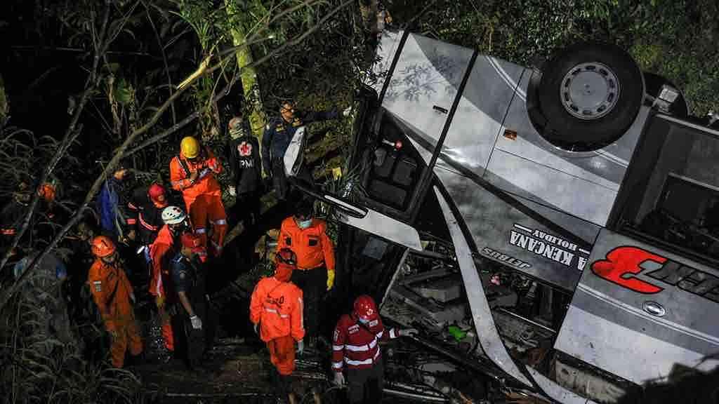 O ônibus com 66 passageiros caiu em uma ravina em Jalan Raya Wado-Malangbong, Sumedang, Java Ocidental por volta das 20h da noite passada. Desde a meia-noite, as equipes de resgate tiveram que retirar várias pessoas presas dentro do ônibus.