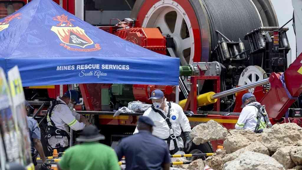 Uma empresa de resgate de minas enviou uma grande gaiola para resgatar os mineradores no local perto de Stilfontein, cerca de 150 km a sudoeste de Joanesburgo, na segunda-feira.