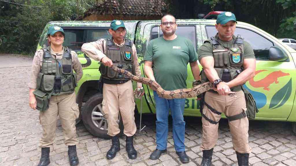 Agentes ambientais exibem a jiboia de 2 metros resgatada na Taquara.