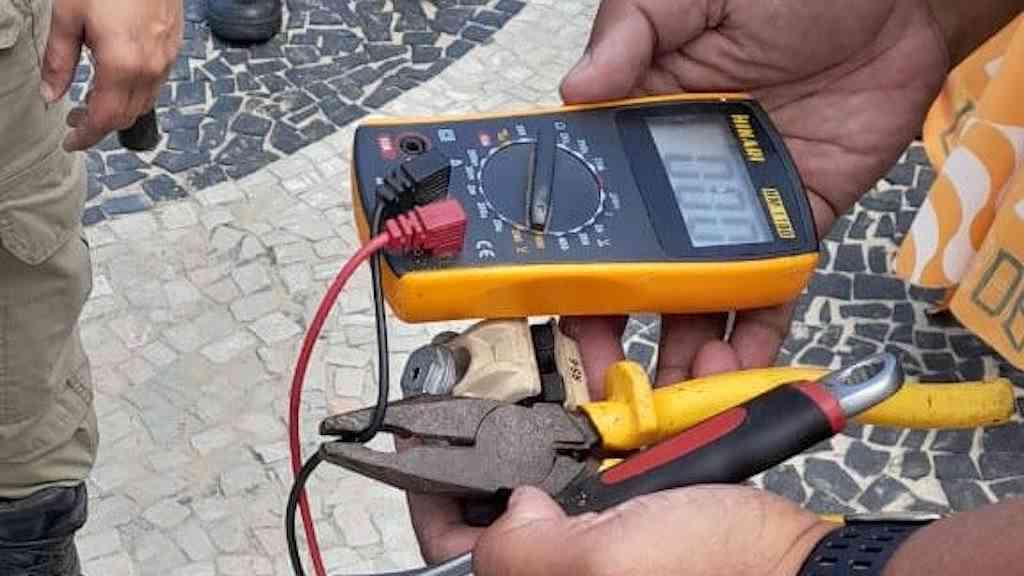 Inicialmente, ele disse que estava fazendo testes na caixa de luz. Contudo, não possuía nenhuma identificação de técnico prestador de serviço. A fiação que ele mexia se conectava à barraca e a uma bomba de água. Foram acionados técnicos da Rioluz, que confirmaram o furto de energia elétrica.