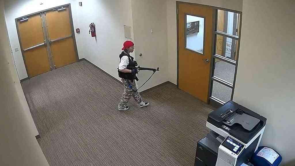 No vídeo divulgado pela Polícia de Nashville, Hale é visto atirando na escola através de um conjunto de portas de vidro, antes de caminhar pelos corredores vazios carregando um fuzil de assalto enquanto as luzes do alarme de emergência piscavam.