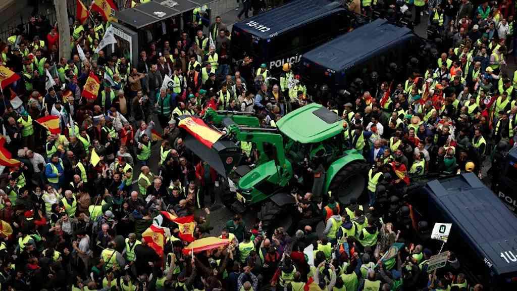 Cerca de 1,5 mil agricultores, segundo a polícia, e mais de 5 mil, segundo associações do setor, se manifestaram nesta segunda-feira em Madri contra “a concorrência desleal” do acordo de comércio entre a União Europeia (UE) e o Mercosul.