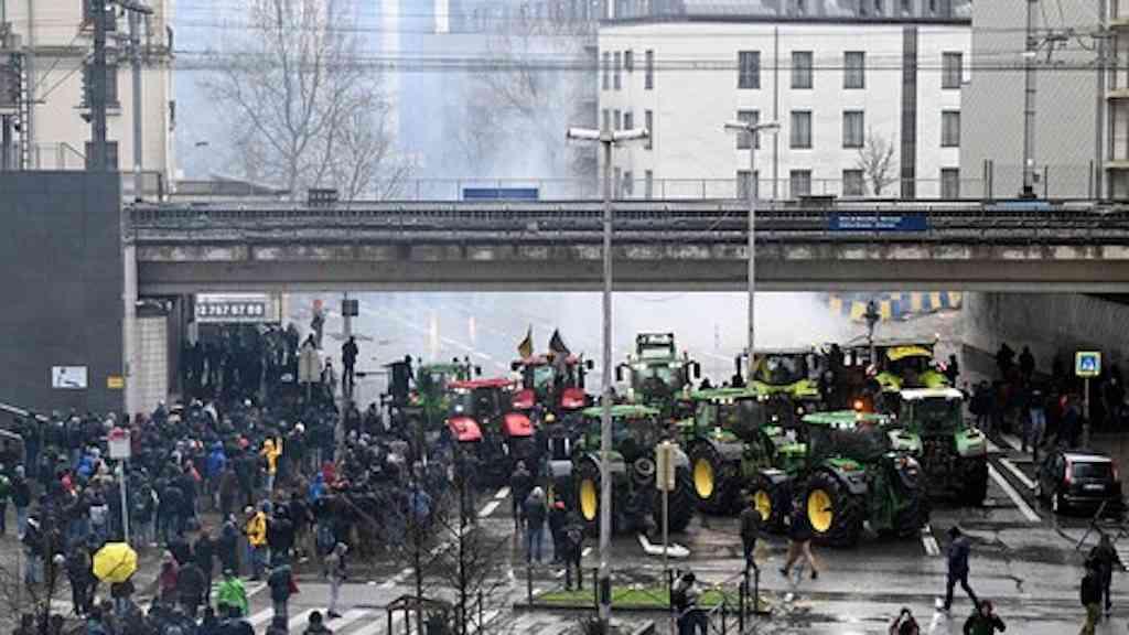 Mais de 100 tratores foram estacionados ao redor da sede das instituições da UE, bloqueando partes de Bruxelas, a uma curta distância da área isolada onde os ministros estavam se reunindo.