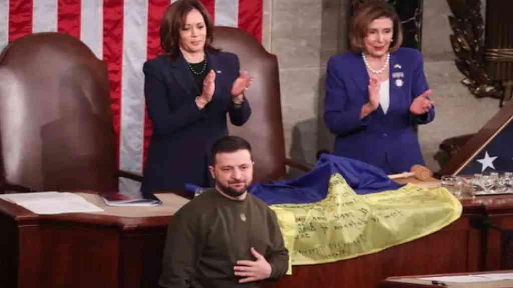 No fim do discurso, Zelensky presenteou o Congresso com uma bandeira ucraniana assinada por militares e que foi aberta no plenário pela vice-presidente Kamala Harris e pela presidente da Câmara, Nancy Pelosi.