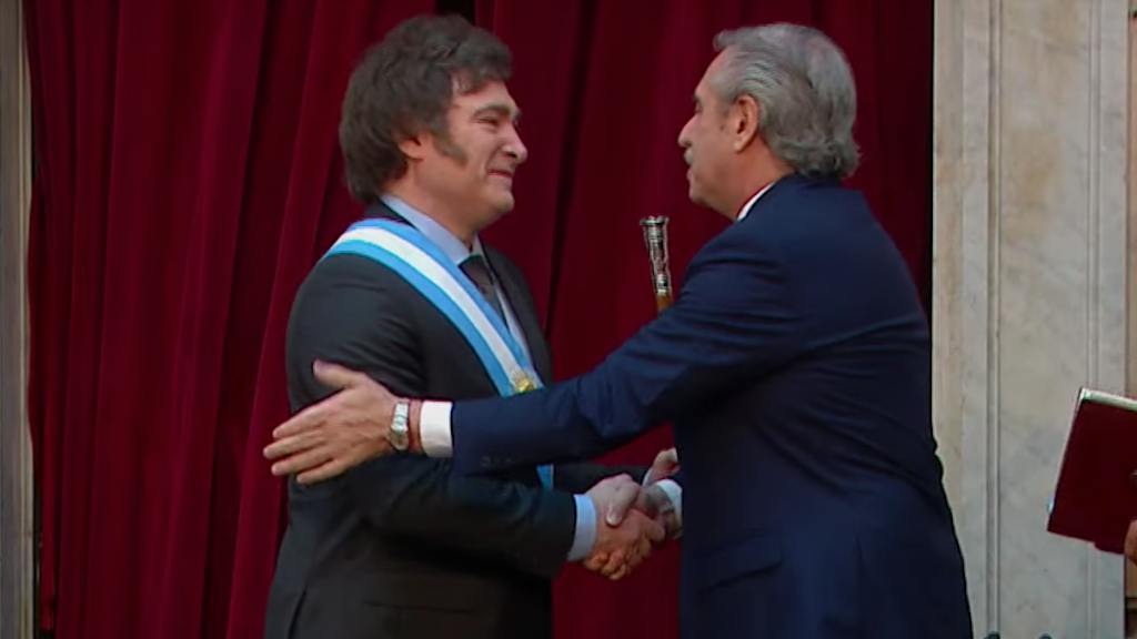 O agora ex-chefe do Executivo da Argentina, Alberto Fernández, passou neste domingo a faixa e o bastão presidencial para o novo presidente do país, Javier Milei. Os objetos representam o símbolo do poder argentino e marcam o início do mandato do libertário. Depois do fim da cerimônia de transição, Milei seguirá para as escadarias do Congresso, onde fará um discurso à nação.