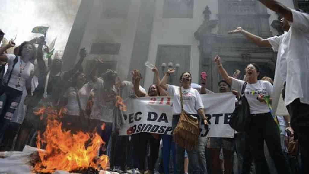Enquanto a Alerj discutia os projetos, servidores protestavam contra as medidas do lado de fora. A manifestação ocorria tranquila, do lado de fora. Até que um grupo de manifestantes forçou a derrubada de uma grade e subiu na escadaria. A Força Nacional usou bomba e spray de pimenta para conter o protesto.