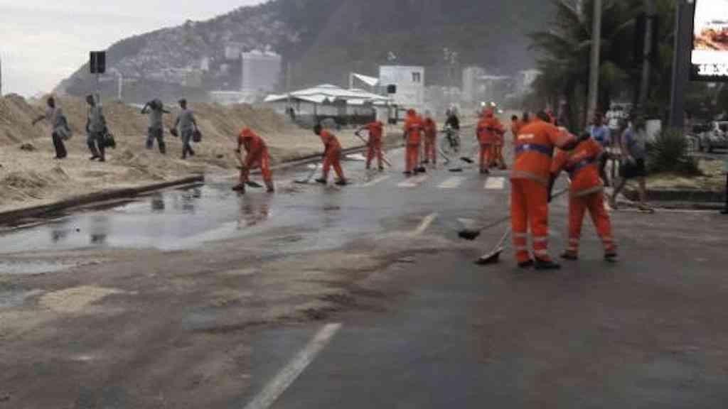 Entre eles caminhões basculantes, pás mecânicas e tratores. A Comlurb informou que a maior parte da areia recolhida foi colocada de volta nas praias.