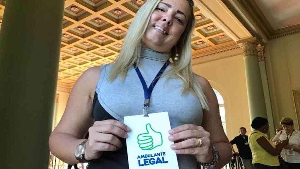 Simone de Araújo Santos, vendedora de acessórios para aparelhos eletrônicos, exibe, orgulhosa, seu crachá de Ambulante Legal