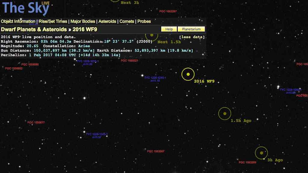 O asteroide 2016WF9 que, segundo o astrônomo russo Dyomin Damir Zakharovich, segue em rota de colisão com a Terra, agora pode ser acompanhado, minuto a miinuto. O corpo celeste, descoberto pela agência espacial norte-americana (Nasa, na sigla em inglês) em meados de 2016, tem capacidade para causar o "fim do mundo”, segundo o cientista.