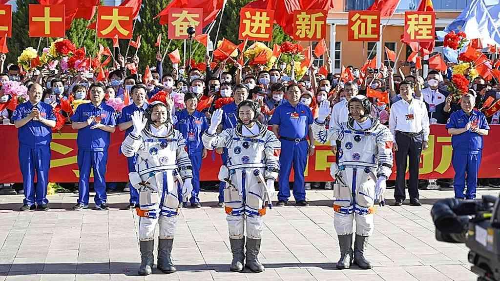 Cai Xuzhe, Chen Dong e Liu Yang, tripulantes da nave Shenzhou-14, durante lançamento oficial, no dia 5 de junho