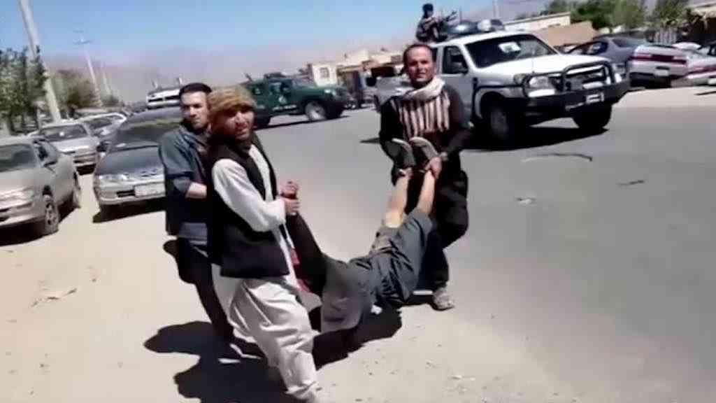 Homens carregam vítima após ataque perto de comício eleitoral do presidente do Afeganistão, Ashraf Ghani, a norte de Cabul