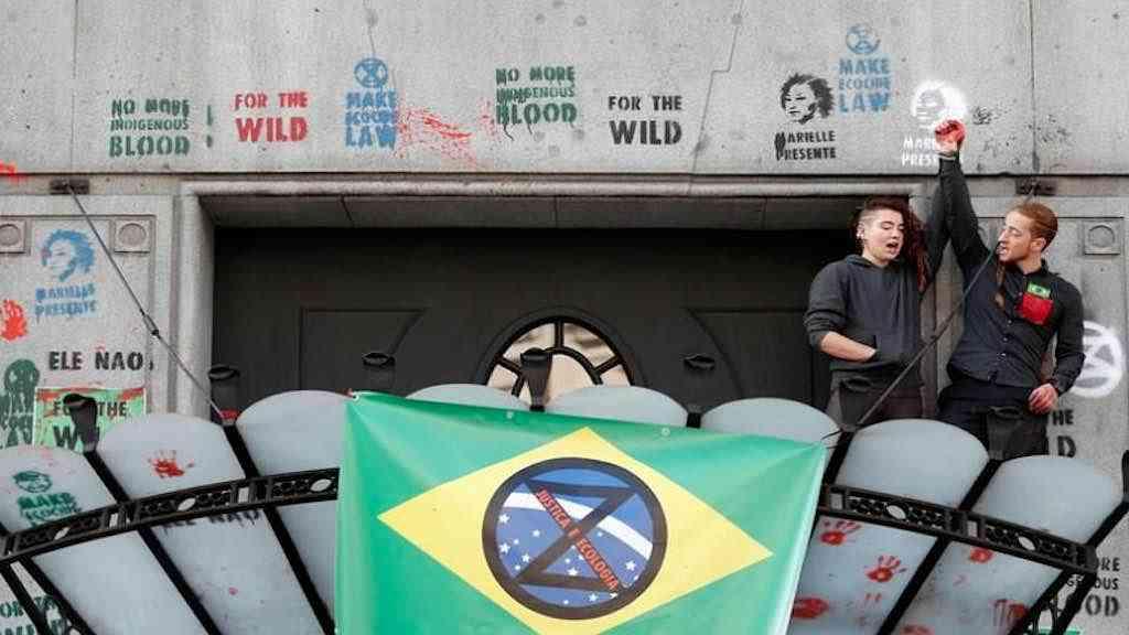 Ativistas do clima protestam na embaixada do Brasil em Londres