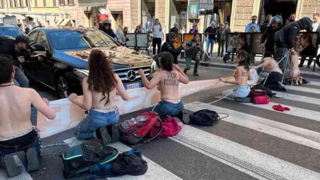 Ao todo, seis mulheres sentaram-se em uma faixa de pedestres na movimentada rua Via del Tritone, que leva à Piazza Barberini, com a frase "Pare com os fósseis" escrita nas costas, além de uma faixa dizendo "Não pagaremos pelos combustíveis fósseis".