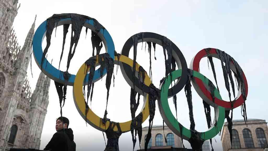 Uma instalação retratava os anéis olímpicos pingando óleo preto, uma denúncia visual das empresas que o grupo acusa de contribuir para o aquecimento global e ameaçar os esportes de inverno, que dependem de condições climáticas frias.