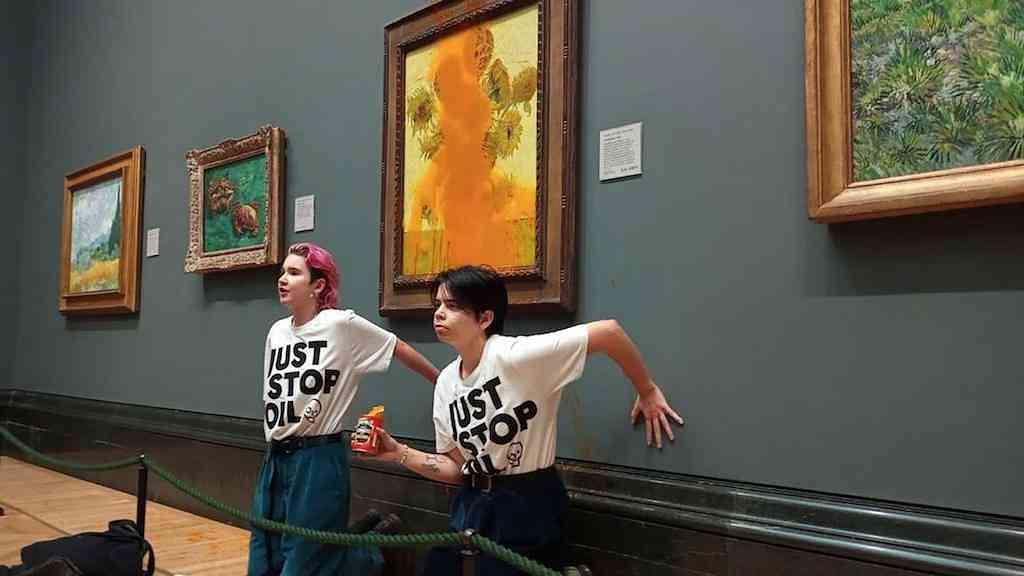 Na véspera, elas jogaram sopa de tomate na obra Girassóis do pintor holandês que está exposta na National Gallery, em Londres. Um vídeo do protesto viralizou nas redes sociais.