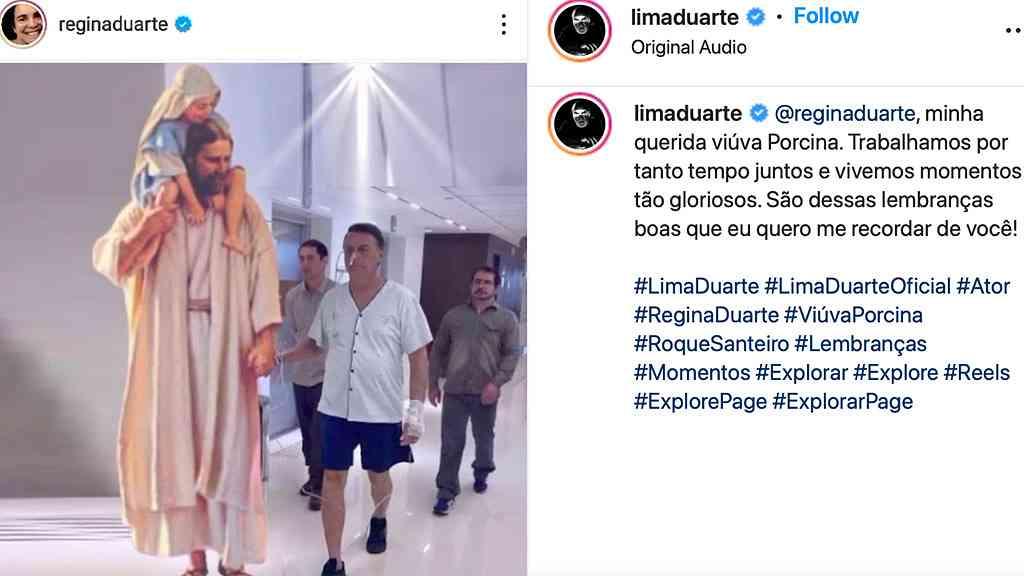 Na mensagem, bem-humorado, Lima lembrou o par romântico que os dois fizeram na novela de Dias Gomes e Aguinaldo Silva e citou a imagem publicada no perfil da colega em que Bolsonaro aparece de mão dada com uma figura divina.