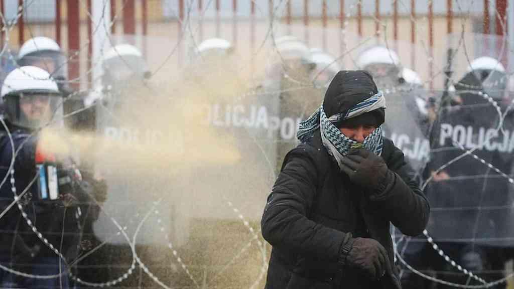 Forças polonesas dispararam gás lacrimogêneo e canhões de água contra os imigrantes que tentavam cruzar a fronteira para a Polônia, enquanto estes atiravam pedras contra os agentes.