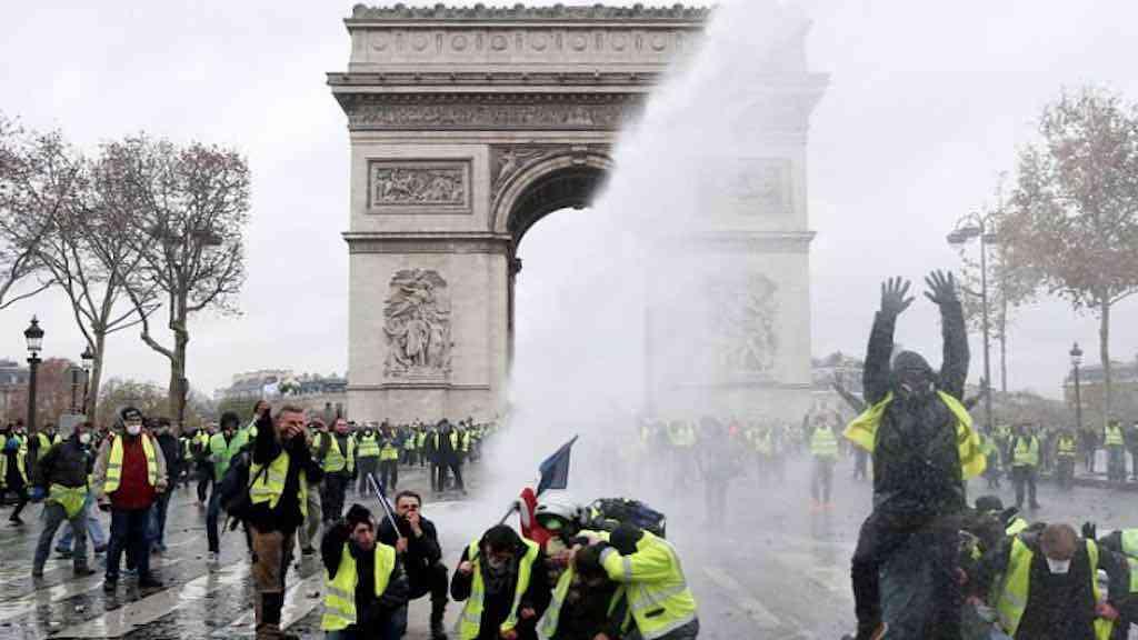 Os revoltosos incendiaram carros, quebraram vidraças, saquearam lojas, espalharam pichações anti-Macron em alguns dos bairros mais abastados de Paris e depredaram o Arco do Triunfo. Muitas pessoas ficaram feridas e centenas foram presas durante batalhas com a polícia.