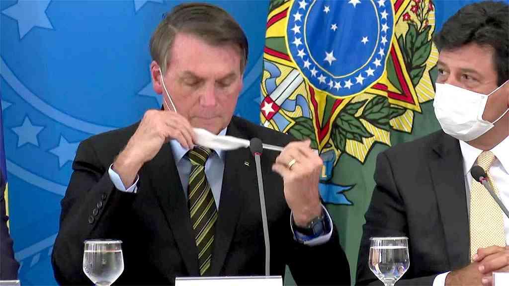 Bolsonaro se atrapalha na hora de vestir a máscara higiênica, ao lado do ministro da Saúde, Luiz Henrique Mandetta, que está com o cargo em risco