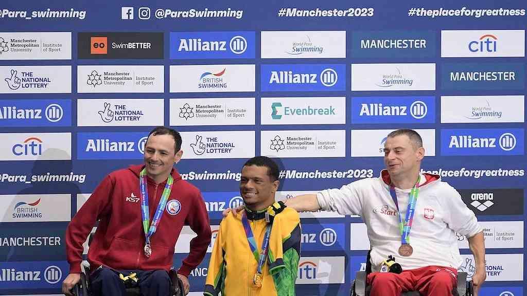 O Brasil alcançou na quarta-feira a quarta posição no quadro de medalhas do Mundial de natação paralímpica em Manchester (Inglaterra), ao subir seis vezes ao pódio, quatro delas com medalhas de ouro. Foi o caso do mineiro Gabriel Araújo, o Gabrielzinho, que conquistou na quarta o bicampeonato na prova dos 100 metros costas, classe S2 (limitação físico-motora) e ainda estabeleceu novo recorde das Américas, em vigor desde desde 2018, e da competição ao completar a prova em 1min55s34. Gabrielzinho deixou para trás o chileno Alberto Abarza (2min06s42), que detinha a melhor marca do continente na prova, e pelo polonês Jacek Czech (2min07s04).
