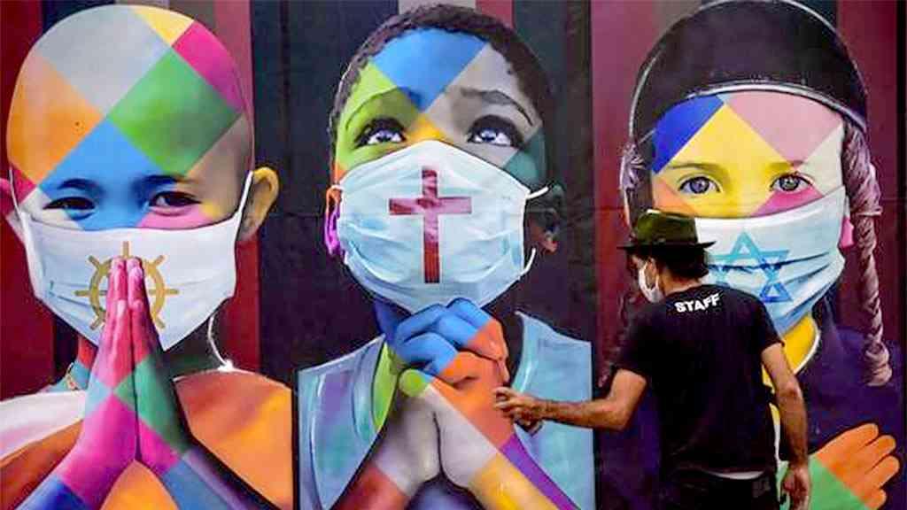 Artista pinta um painel, no Rio de Janeiro, sobre a união necessária no combate à covid-19