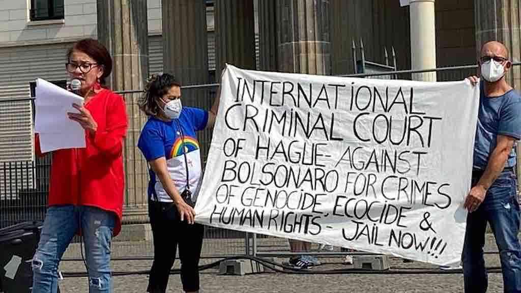 Manifestantes reunidos no Portão de Brandemburgo criticaram a gestão do governo na pandemia e pediram impeachment do presidente. Direitos dos povos indígenas e reforma trabalhista também foram lembrados.