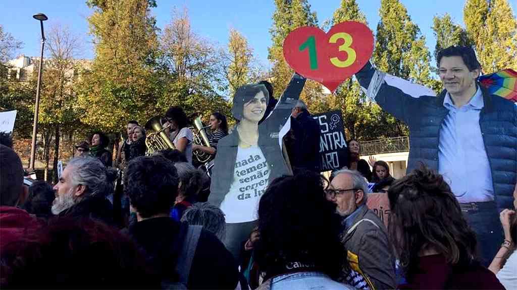 Manifestantes erguem fotos de Manuela e Haddad, no protesto realizado em Paris Mais de 10 mil manifestantes lotaram a praça Stalingrad, em Paris