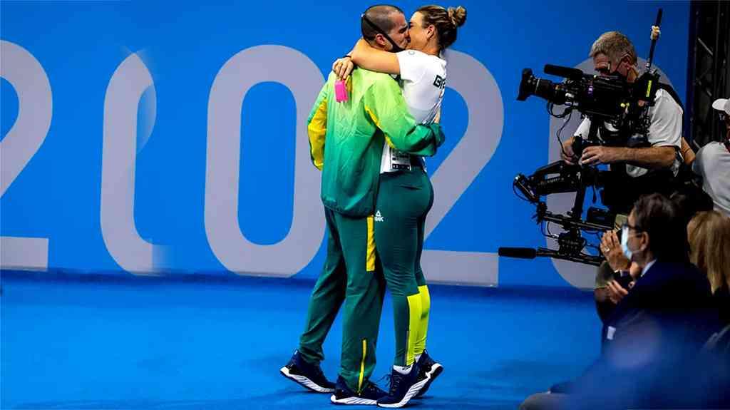 Fratus beija a mulher, Michelle, a quem entregou o buquê recebido junto com a medalha de Bronze na Natação