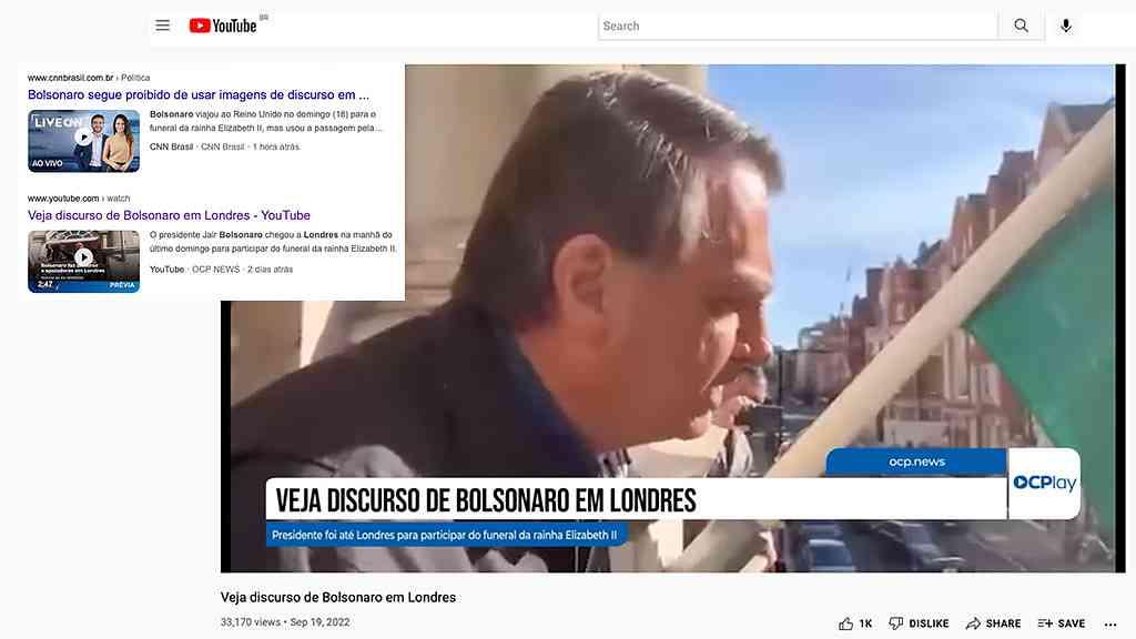 Embora o Plenário do Tribunal Superior Eleitoral (TSE) tivesse mantido nesta quinta-feira, por unanimidade, a decisão do ministro Benedito Gonçalves de vetar o uso eleitoral do discurso proferido por Jair Bolsonaro (PL) em Londres, no domingo, o conteúdo estava disponível no Youtube, principal plataforma de vídeos da internet ainda nesta tarde.