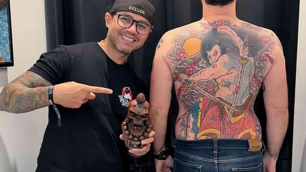– Tivemos que desmontar a loja, para montar o estande lá, e na segunda-feira estava tão cansado que fechei a loja às 17h. Não aguentava nem falar. É muito cansativo mesmo”. Ele tatuou na hora, no local da prova, mas já estava trabalhando a peça há seis meses, especificamente para a convenção. Foram várias seções por semana no corpo do gerente da loja, Andre Santana. Foram cerca de 120 horas para fazer a tatuagem vencedora que pega as costas, as nádegas e metade das coxas para cima. O tempo foi recorde porque, normalmente, um desenho como esse demora mais de um ano para se fazer. “O que chamou muita atenção foi o fato de a tatuagem (o samurai) ter tatuagem também.