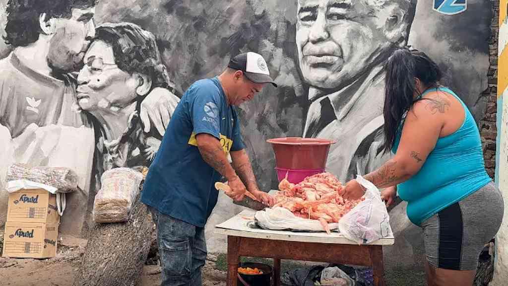 Toda semana, centenas de pessoas fazem fila para encher um contêiner de plástico com alimentos em um lugar improvável: a humilde casa onde nasceu a lenda do futebol argentino Diego Armando Maradona.