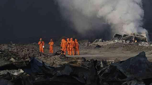 Soldados e agentes de resgate chineses, usando máscaras de gás e trajes especiais, fizeram uma busca por materiais tóxicos no porto de Tanjin, na China, neste domingo.