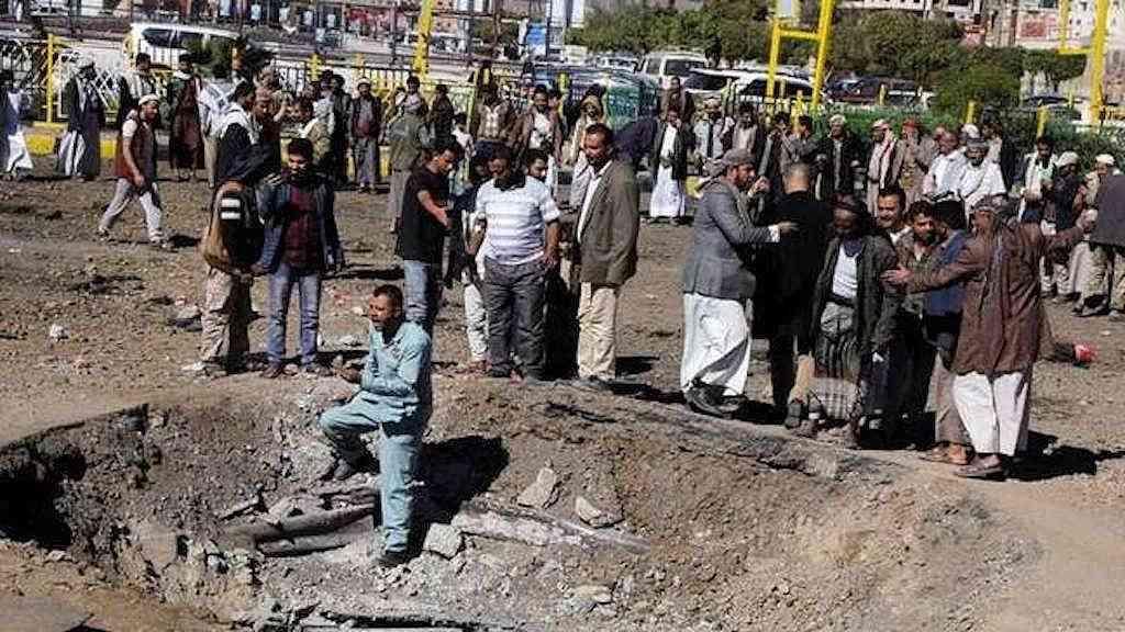 Homem reage em cratera formada por ataque aéreo conduzido por coalização de liderança saudita em Sanaa, no Iêmen