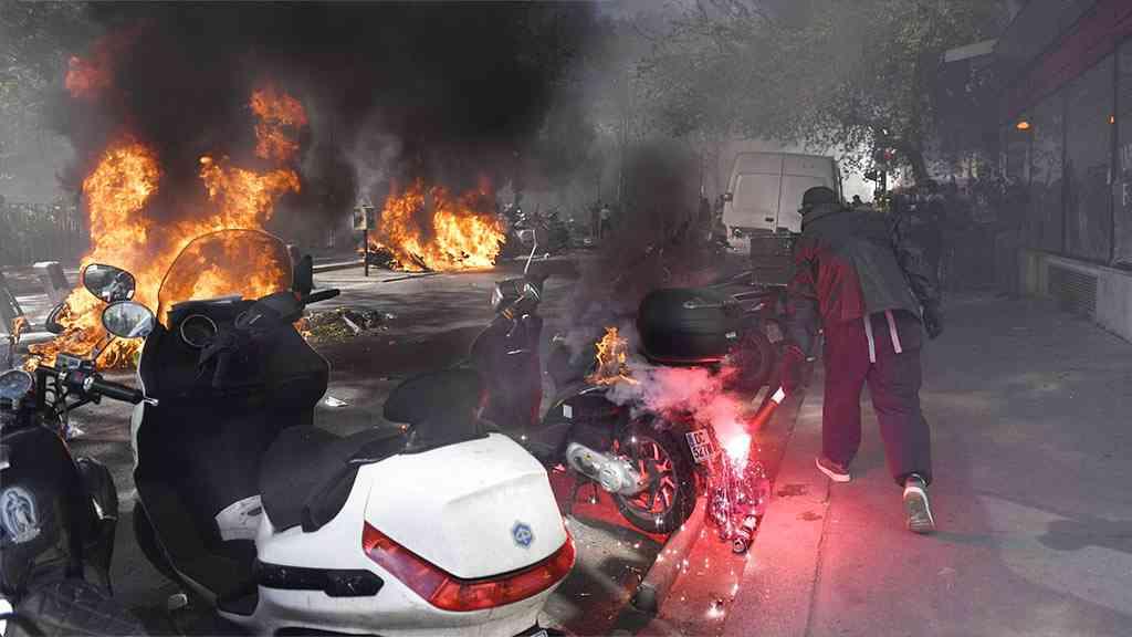 Manifestantes vestindo capas pretas atearam fogo a veículos nas ruas das principais cidades francesas