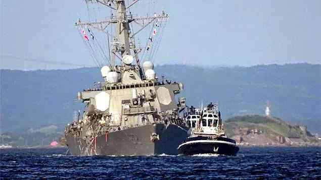 O destróier da Marinha dos Estados Unidos USS Fitzgerald chegou adernado à sua base em Yokosuka, ao sul da Baía de Tóquio. Sete de seus marinheiros ainda desaparecidos após uma colisão com um navio cargueiro filipino mais de três vezes maior que ele. A ocorrência do acidente de tráfego marítimo ocorreu a leste do Japão, no início deste sábado.