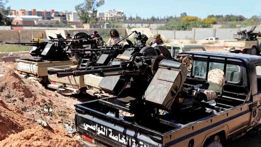 Veículos armados de forças de Misrata, sob proteção das forças de Trípoli, perto de campo militar em Trípoli