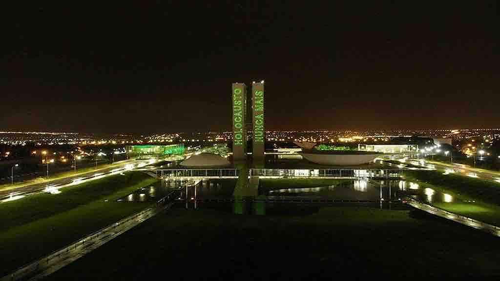 O Congresso Nacional foi iluminado na noite desta quarta-feira para lembrar os seis milhões de judeus e outras minorias exterminados pelo nazismo. A partir das 19h, foi feita a projeção nos prédios do Congresso Nacional da frase “Holocausto Nunca Mais”, em alusão ao Dia do Holocausto e do Heroísmo ou Iom HaShoá VehaGvurá (em hebraico). A projeção foi solicitada pela Confederação Israelita do Brasil