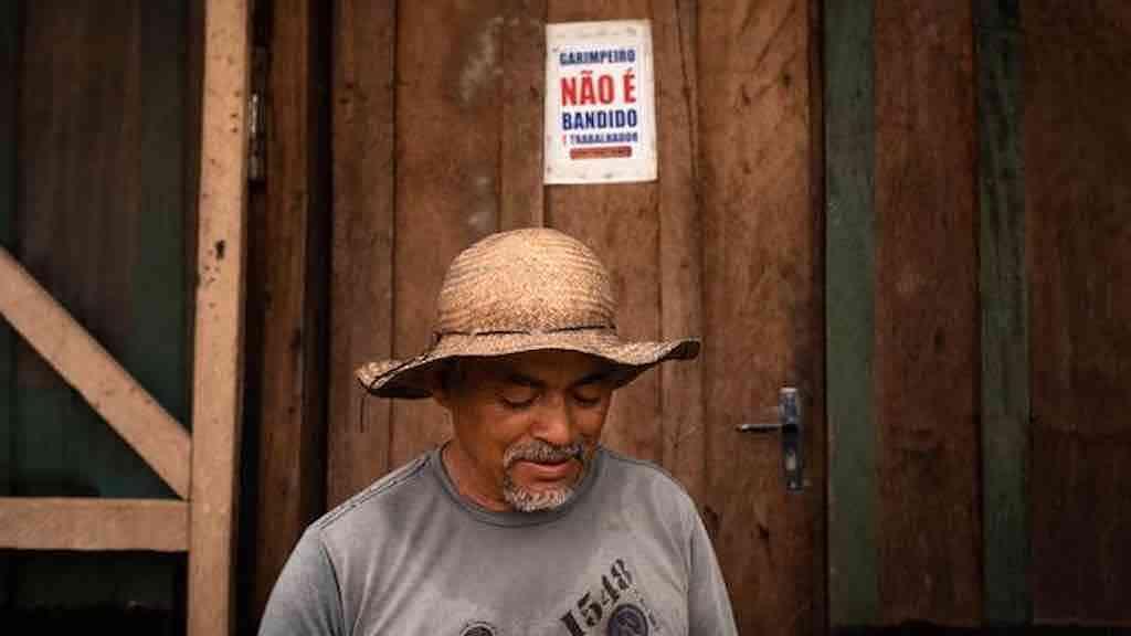 Garimpeiro no Pará diante de placa com os dizeres: "Garimpeiro não é bandido"
