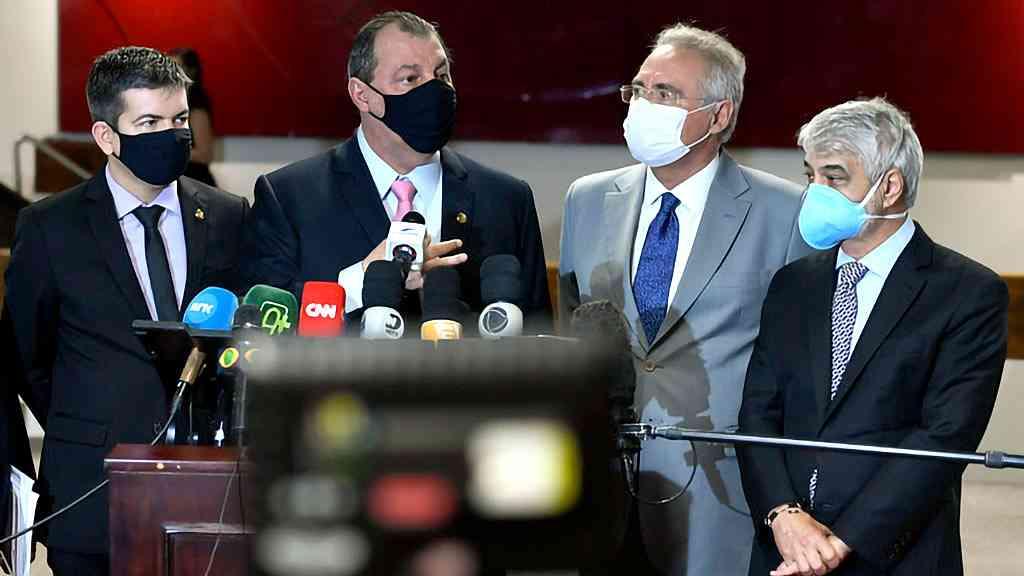 Líderes da CPI da Covid, da esq. p/ dir., os senadores Randolfe Rodrigues (Rede-AP), vice-presidente; Omar Aziz (OSD-AM), presidente; e Renan Calheiros (MDB-AL), relator; além do representante da oposição, Humberto Mota (PT-PE)