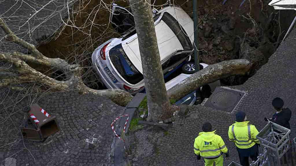 Uma árvore também caiu, e uma tubulação se rompeu na cratera, surgida no bairro de Vomero, situado nas colinas de Nápoles.