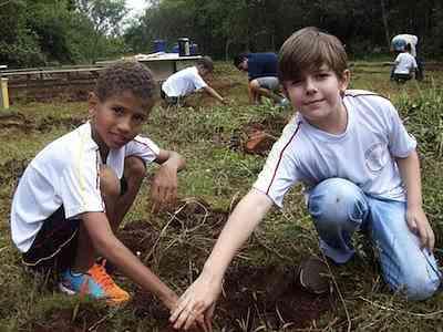 Crianças plantam árvores em comemoração do Meio Ambiente