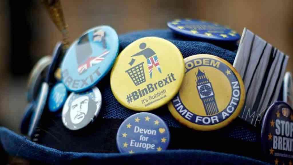Broches anti-Brexit presos em chapéu de manifestante em frente ao Parlamento britânico, em Londres