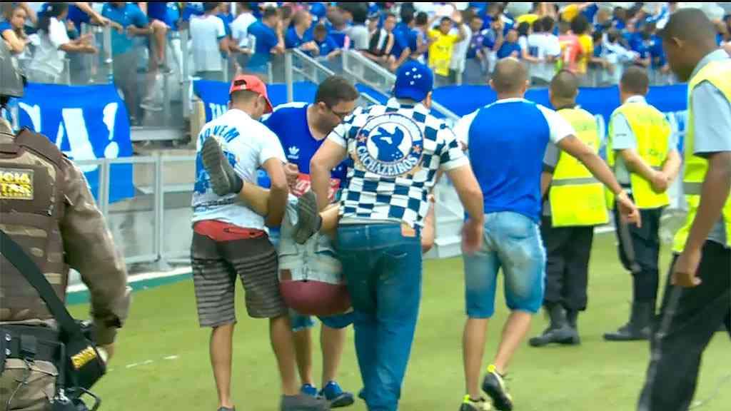 Torcedor do Cruzeiro é carregado para receber cuidados médicos, após tumulto nas arquibancadas