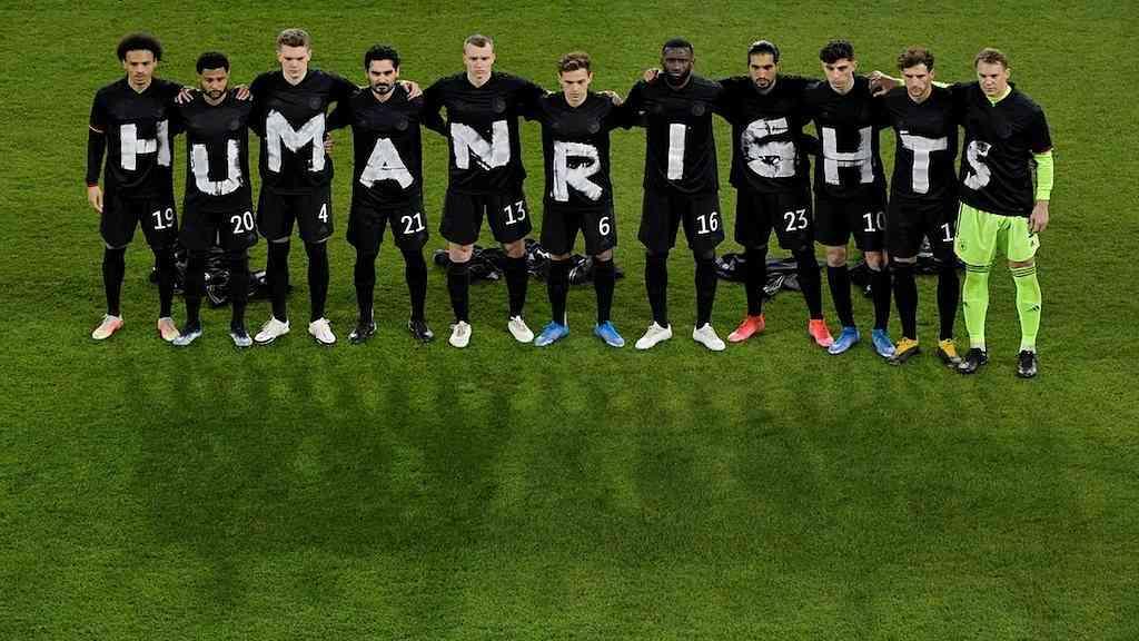 Os jogadores da Alemanha adotaram um posicionamento importante ao mostrar apoio aos operários imigrantes que constroem os estádios da Copa do Mundo de 2022 no Qatar, e o técnico Joachim Loew disse que a seleção defende os direitos humanos, "não importa o local". Os jogadores da Alemanha adotaram um posicionamento importante ao mostrar apoio aos operários imigrantes que constroem os estádios da Copa do Mundo de 2022