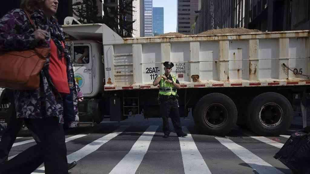 A polícia também usou os caminhões de areia para proteger a Trump Tower. Lar e sede de campanha do presidente eleito dos EUA, Donald Trump, que fica nas proximidades.