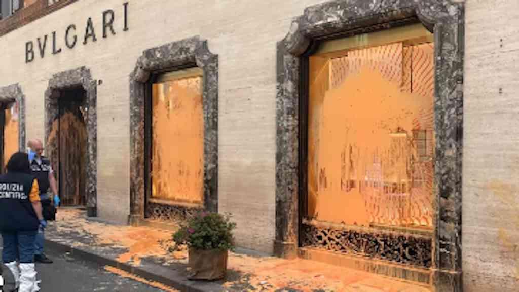 Ativistas ambientais pintaram diversas fachadas de lojas de luxo no centro de Roma, em um novo protesto na capital da Itália, nesta quinta-feira.